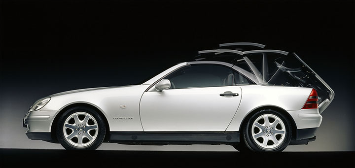 Впервые подобный механизм был применен на Peugeot 401 Eclipse в 1934 году, но из-за сложности и дороговизны распространения не получил. На новом витке технологической эволюции складывание и развертывание крыши стало полностью автоматическим и занимало всего 25 секунд. На этот раз идея «выстрелила». Легкость трансформации из родстера в купе и обратно не только привлекла дополнительных клиентов к «Мерседесу», но и заставила других производителей открытых машин предложить похожую конструкцию. Технически SLK базировался на современном ему седане C-класса, но, как принято у компактных легких родстеров, обходился только 4-цилиндровыми двигателями.