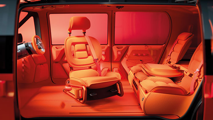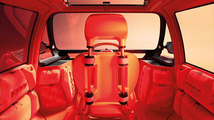 Длина машины равна 4,1 метра, при этом в наиболее вместительной версии салон рассчитан на шесть человек. Четыре двери открываются в противоположных направлениях, а отсутствие центральной стойки обеспечивает легкий доступ при ширине проема 1,9 метра. Дизайнеры исходили из того, что не экипаж должен адаптироваться к автомобилю, а автомобиль адаптируется к потребностям пассажиров. Дизайн заднего бампера устроен так, чтобы можно было закрепить сиденье и вы могли с удобством переобуться после похода.