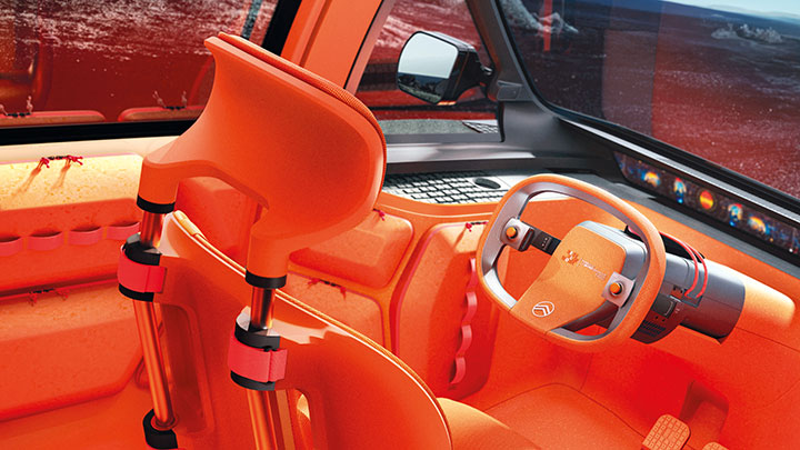 Поучаствовали в проекте и специалисты Goodyear, разработавшие новые «умные» шины, которые подходят для ежедневного использования и периодических поездок по бездорожью. Комплекс технологий Goodyear SightLine помогает контролировать давление и износ шин в режиме реального времени через специальное приложение. Встроенный в обод светодиод показывает правильное давление (зеленое свечение) или недостаточное давление (красное свечение). Оранжевый оттенок кузова воплощает жизнерадостный характер концепта. Цвет меняется в зависимости от освещения, переходя от оранжевого к красному, а затем к желтому, визуально поддерживая тему динамики и движения.