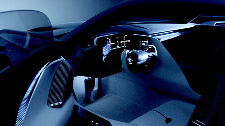 Интерьер прототипа выполнен в лаконичной манере, функциональные компоненты расположены вокруг пилота. Рулевое колесо исключает необходимость менять хват при выполнении поворотов, а положение переключателей позволяет управлять, не отрывая глаз от трассы и надежно контролируя автомобиль.