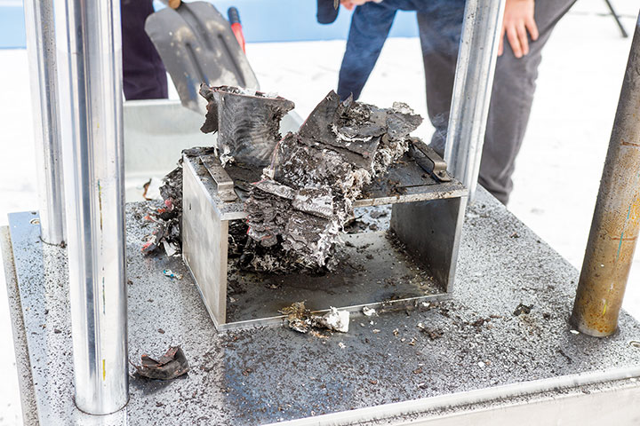 Первый из испытанных элементов является компонентом батареи, устанавливаемой в электромобили BYD. Сквозной прокол не вызвал сколько-нибудь тревожащей реакции – элемент LFP не деформировался и не загорелся, не было никаких разрушений, кроме аккуратного отверстия от прокола. Элемент же NCM после прокола мгновенно отреагировал реактивной струей серого дыма, а затем после громкого хлопка вспыхнул ярким огнем, за несколько секунд превратившись в кучку пепла. Комментариев к эксперименту не потребовалось.