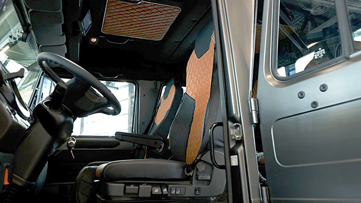 Unimog окрашен в практичный матовый серый цвет. Колесные диски выполнены из алюминия. Кабина прототипа вмещает до четырех человек. Внутри установлены эргономичные сиденья. Салон отделан кожей премиального качества. Автомобиль оснащен системой MirrorCam: цифровые камеры и мониторы в нем заменили традиционные наружные зеркала, обеспечивая водителю хорошую круговую обзорность.