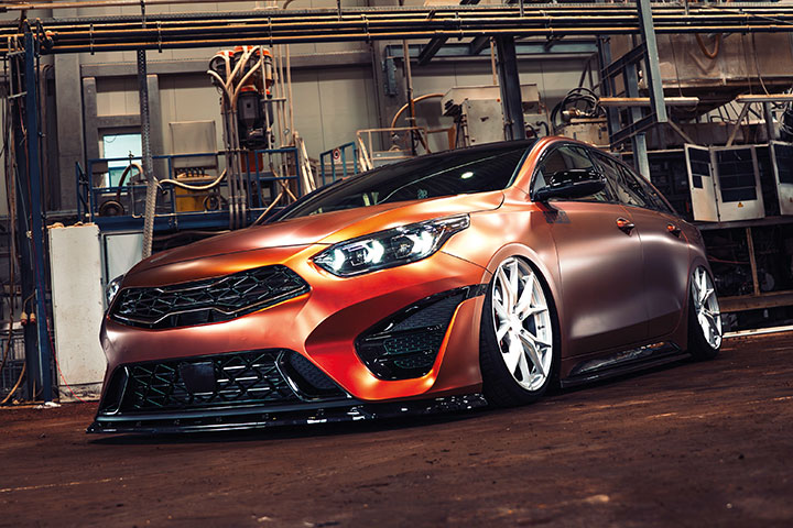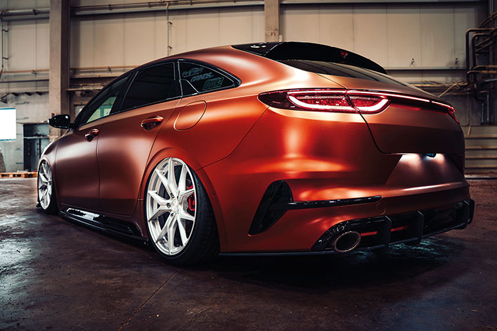Для гармоничного образа тюнинг-команда @deepwerk сократила клиренс шутинг-брейка с помощью пневматической подвески Grinds. В наиболее низком положении всего несколько сантиметров отделяют спойлеры черного обвеса Maxton Design от земли. Пленка цвета меди идеально дополняет стиль представленного на фото Kia Pro Ceed GT.